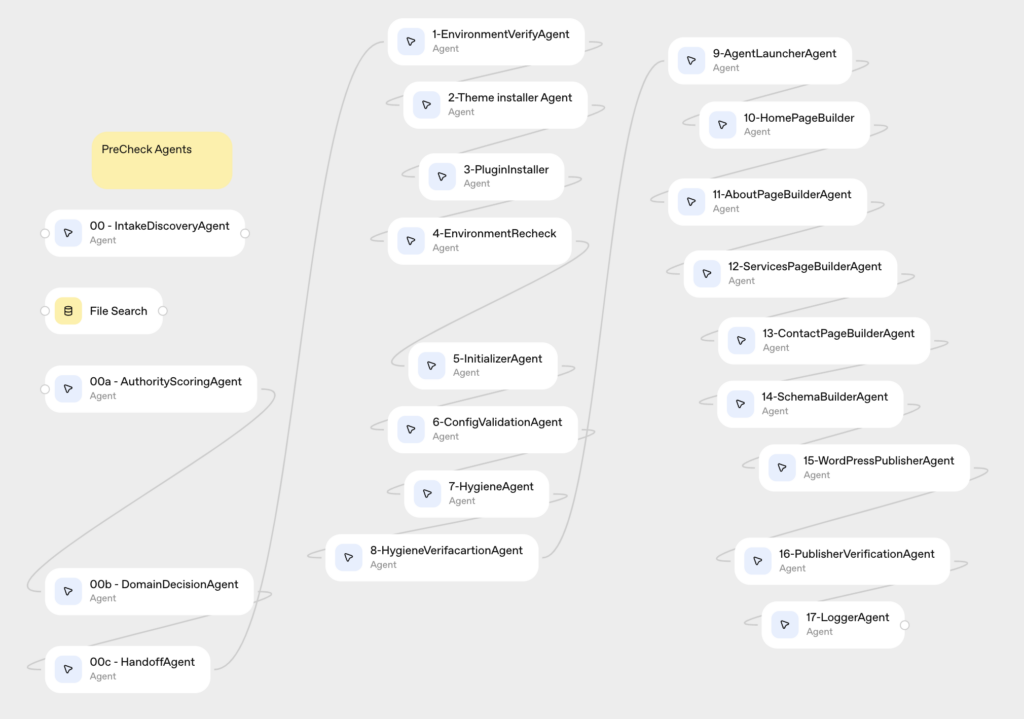 At first, we built agents to handle every step of a WordPress build—one agent for the header, another for the footer, another for changing the theme, and so on. That workflow got out of hand quickly. It showed us a big issue that agents can go over course, or hallucinate.