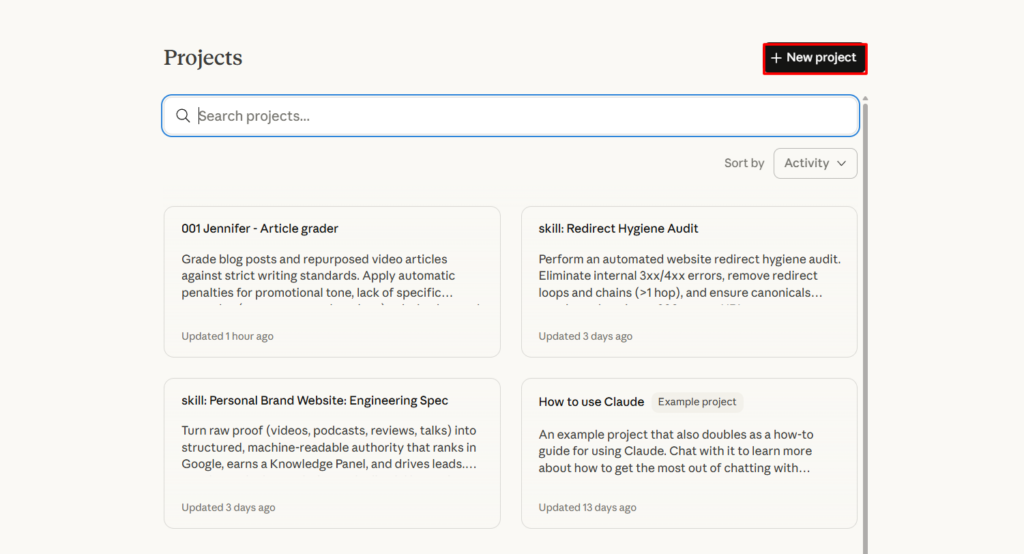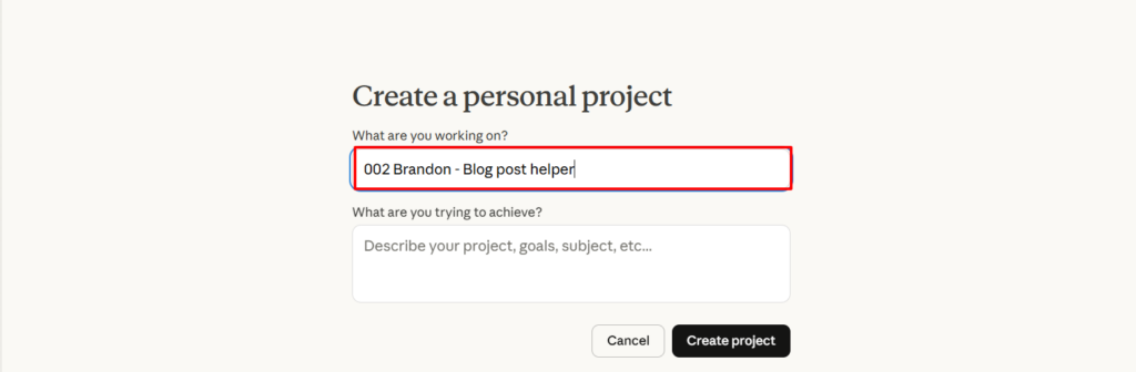 Go to claude.ai and create a new project. Name it “002 Brandon – Blog post helper.”