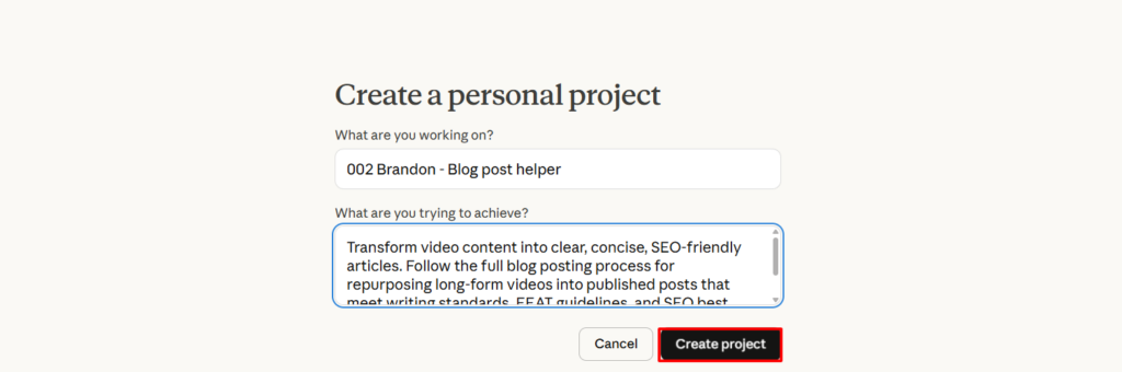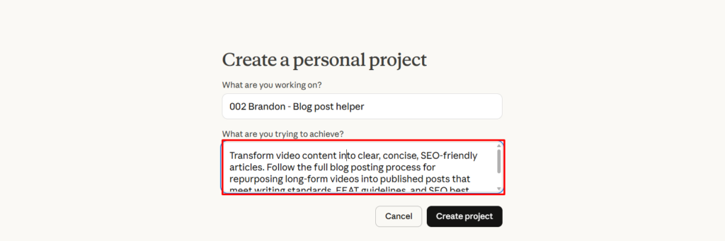 In the project description field, write: “Transform video content into clear, concise, SEO-friendly articles. Follow the full blog posting process for repurposing long-form videos into published posts that meet writing standards, EEAT guidelines, and SEO best practices.”