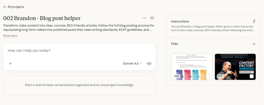 Copy everything above, paste it into your Claude project, and Brandon is ready to help you turn your next video into a published article.