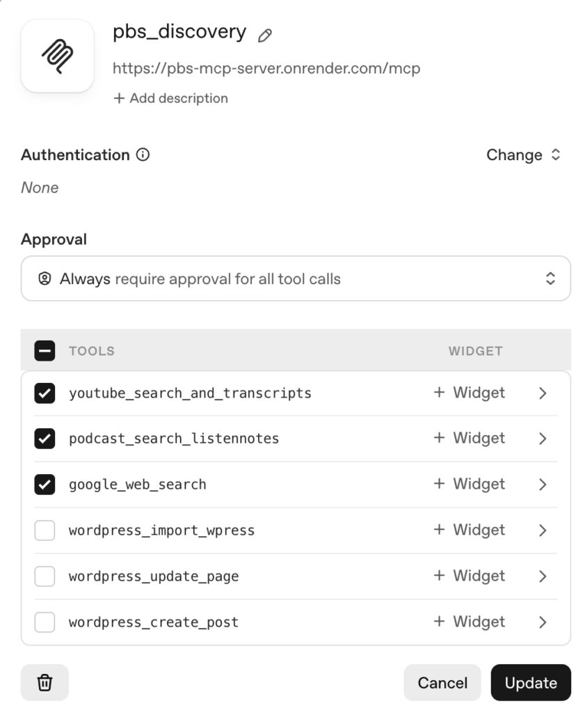 For our Agentbuilder we have set up mcp’s that go and gather information form Youtube, google and socials to grab information about you, and then we pump that information through a number of agents to fill your website and create blog posts on your site. All of which leads to having more authority on Google and being able to claim your knowledge panel. Inside agent 1 is our PBS discovery agent, we give it our credentials, and then via the MCP we have set up it will go and call those tool to pull data from google and youtube.