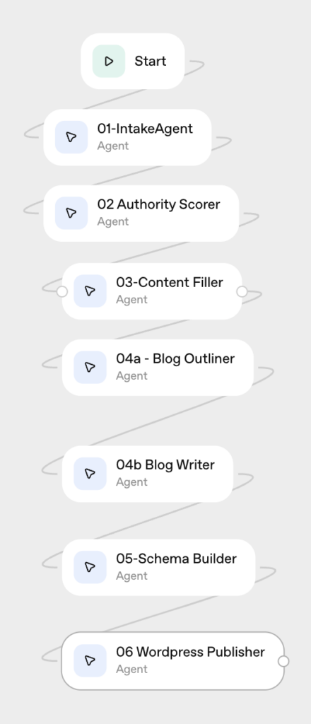 The information gathered then gets sent to Agent 02 to score the authority of it, and then hand off to be turned into content. We have used our GPT’s like Jennifer to configure this data we pull into content that will fill your site.