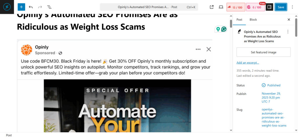 You can check the final article I created via this link https://blitzmetrics.com/opinlys-automated-seo-promises-are-as-ridiculous-as-weight-loss-scams/