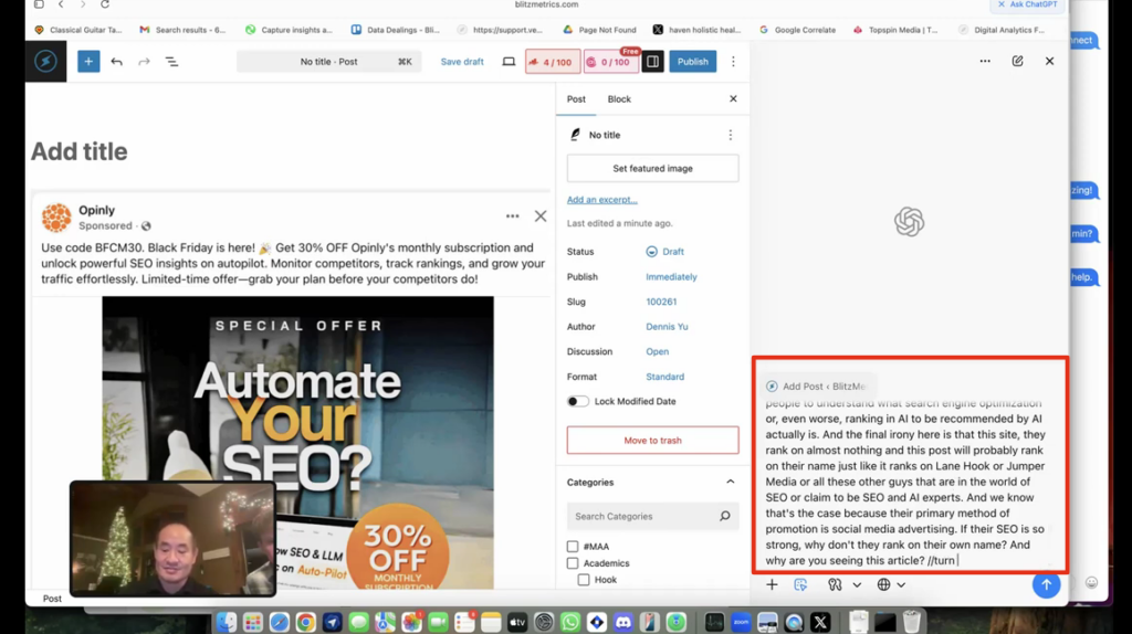 “I just saw this Facebook ad from this service called Opinly where they promise that they can automate your SEO because their magic tools allow you to monitor competition, track rankings, and grow your traffic effortlessly.”