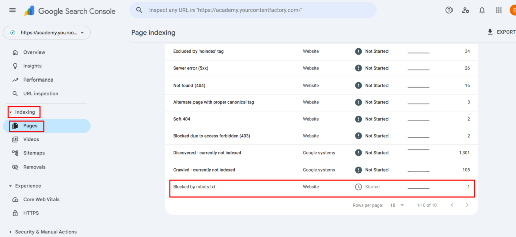Navigate to Indexing > Pages, then click on “Blocked by robots.txt”.