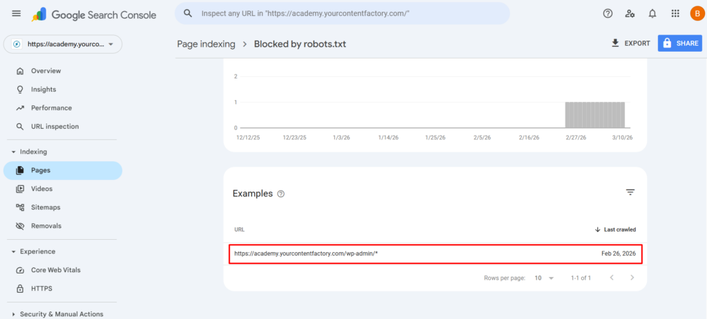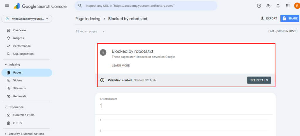 Then go back to Google Search Console under Indexing > Pages > Blocked by robots.txt and click Validate Fix so Google rechecks the page.