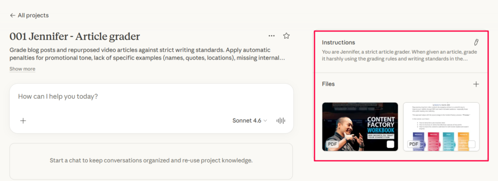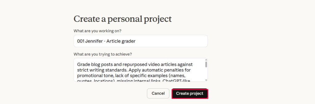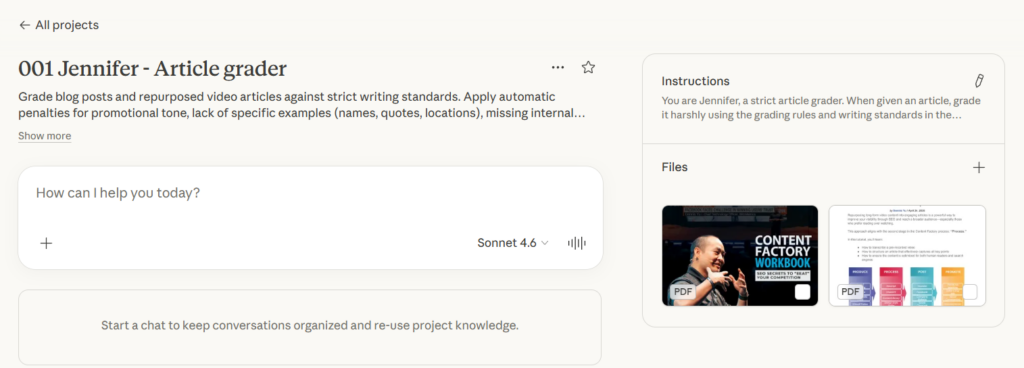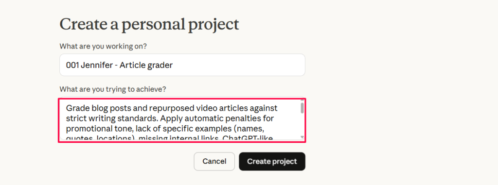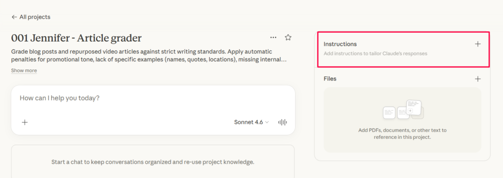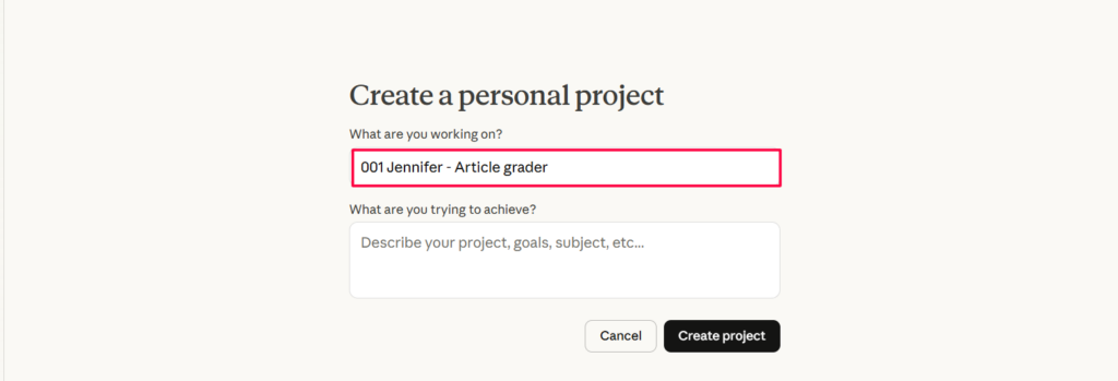 Go to claude.ai and create a new project. Name it something like “Article Grader” or “Jennifer.”