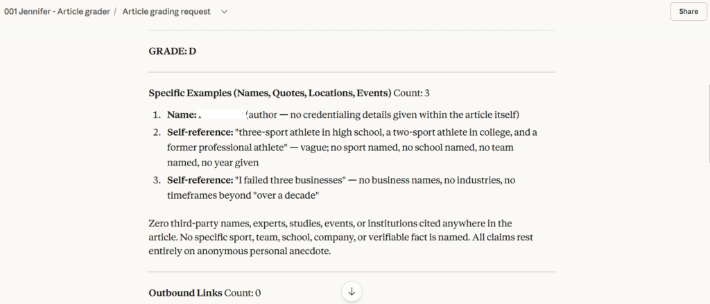 Jennifer does not just give you a letter grade. She counts every specific example in the article, including names of real people, direct quotes, real locations, and actual events. She counts every outbound link. She tells you exactly what is missing and what needs to change.