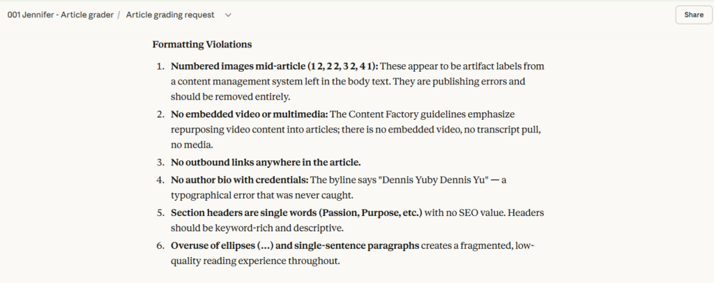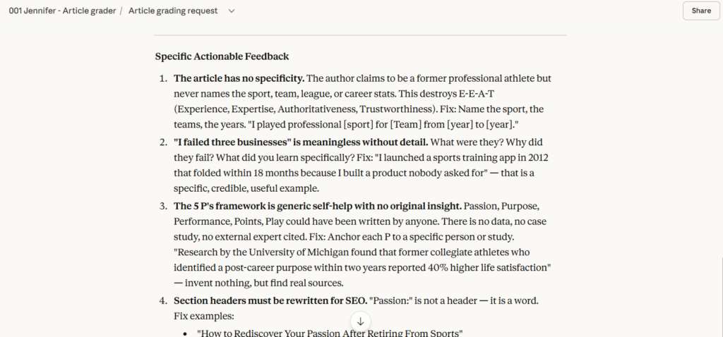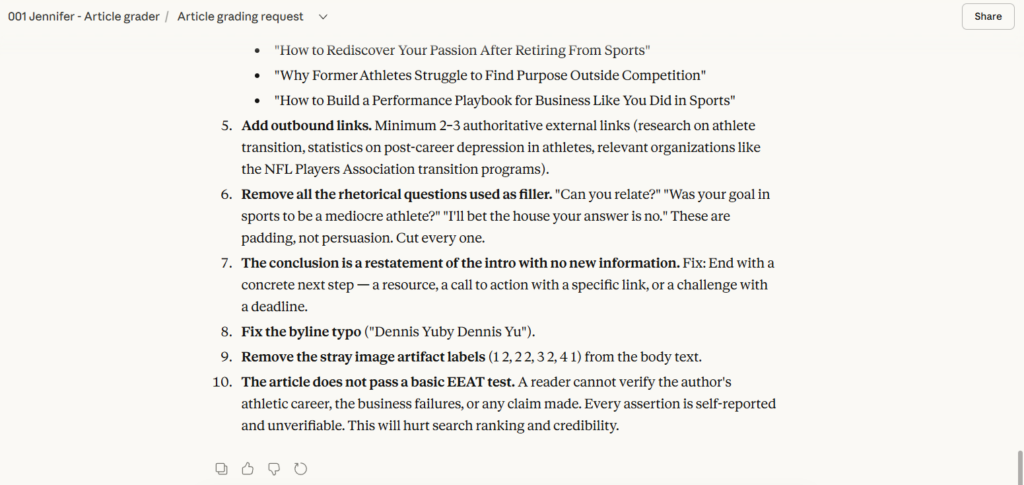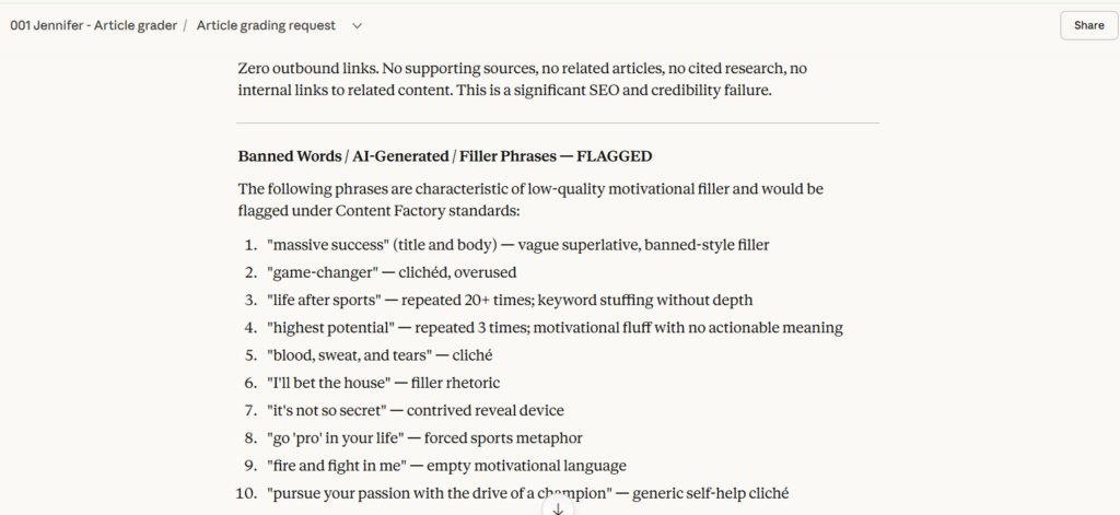 Copy everything above, paste it into your Claude project, and Jennifer is ready to grade your next article.