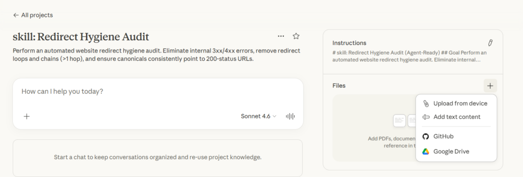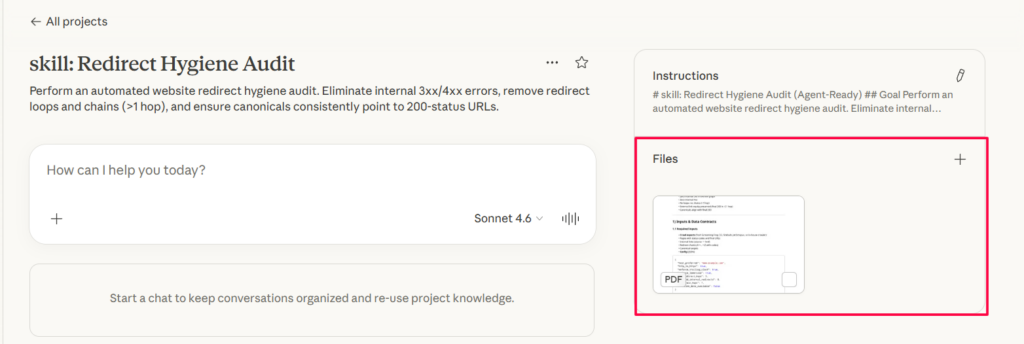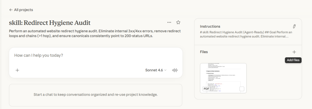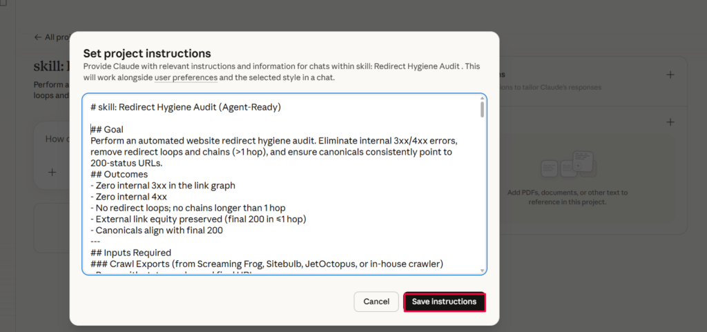 This is a Claude skill file that automates the entire redirect audit process. Drop it into a Claude Project, feed it your crawl data, and it will evaluate your site against 20 business rules, classify every violation by severity, score impact using backlinks and traffic signals, generate a prioritized task list with owners, and output server rule snippets ready for deployment.
