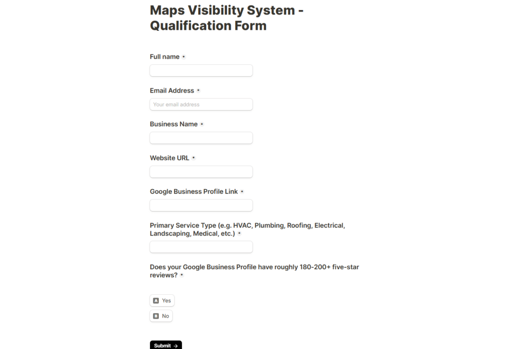 The structure of the Maps Visibility System doesn’t change between HVAC, roofing, plumbing, or other local service categories. Only the language, examples, and figurehead positioning shift.